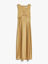 Abito lungo smanicato in prezioso raso enver satin, con finitura opaca sul corpetto e gonna svasata semilucida. Modello sfoderato dalla linea scivolata con vita leggermente alta, scollo a V incrociato sul davanti e coulisse in vita sul retro per evidenziare la silhouette e creare un volume arricciato. Chiusura a goccia sul retro.